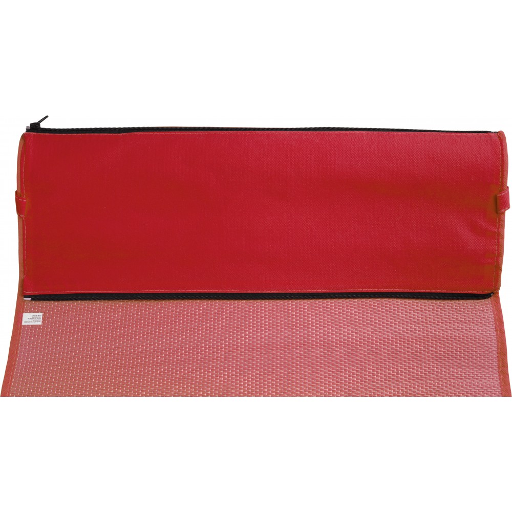 Összehajtható napozó színben illeszkedő hordozópánttal. Cipzárral összezárt mérete: 2,5 x 71 cm. PP nemszőtt anyag. Emblémázás: Szitanyomás