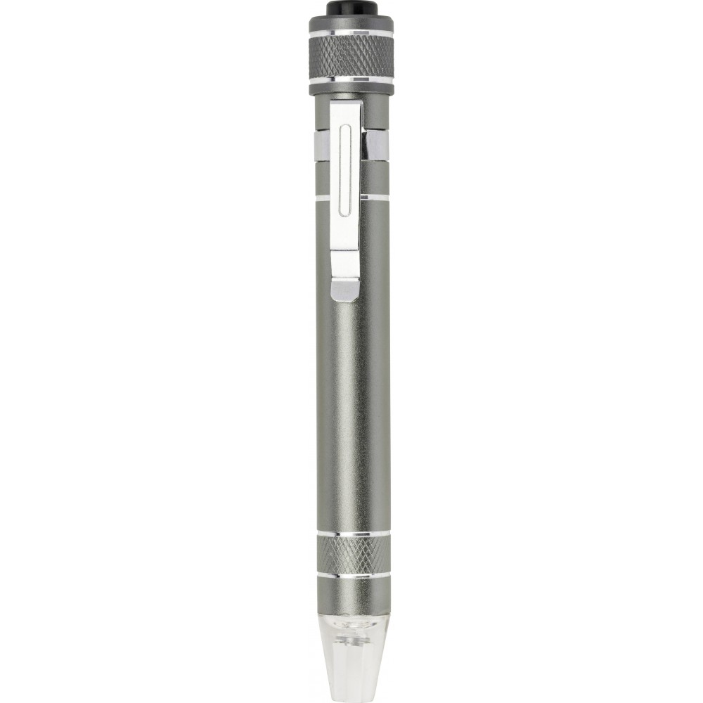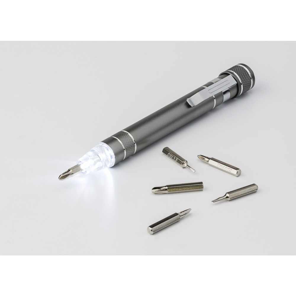 Alumínium csavarhúzókészlet lámpával. Tartalma: 3 db lapos csavarhúzó és 3 db csillagcsavarhúzó. Az elemet tartalmazza. Emblémázás: Gravírozás, Tamponnyomás