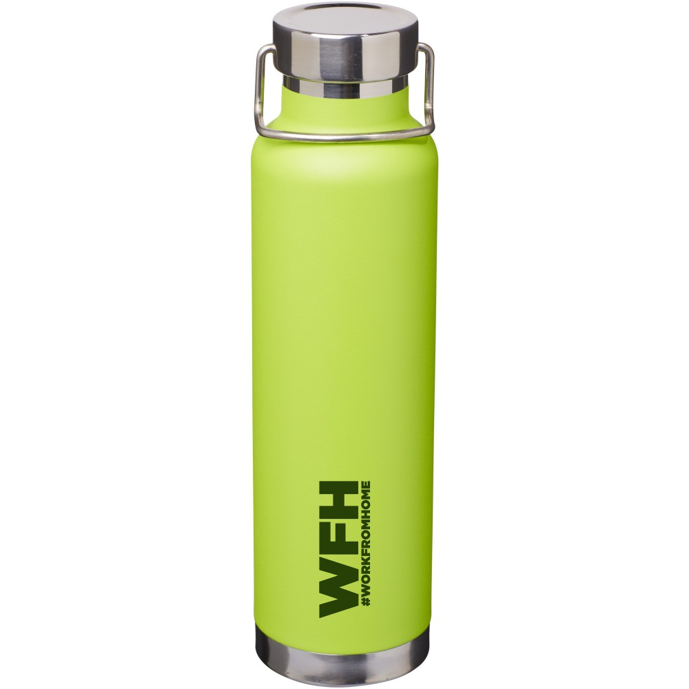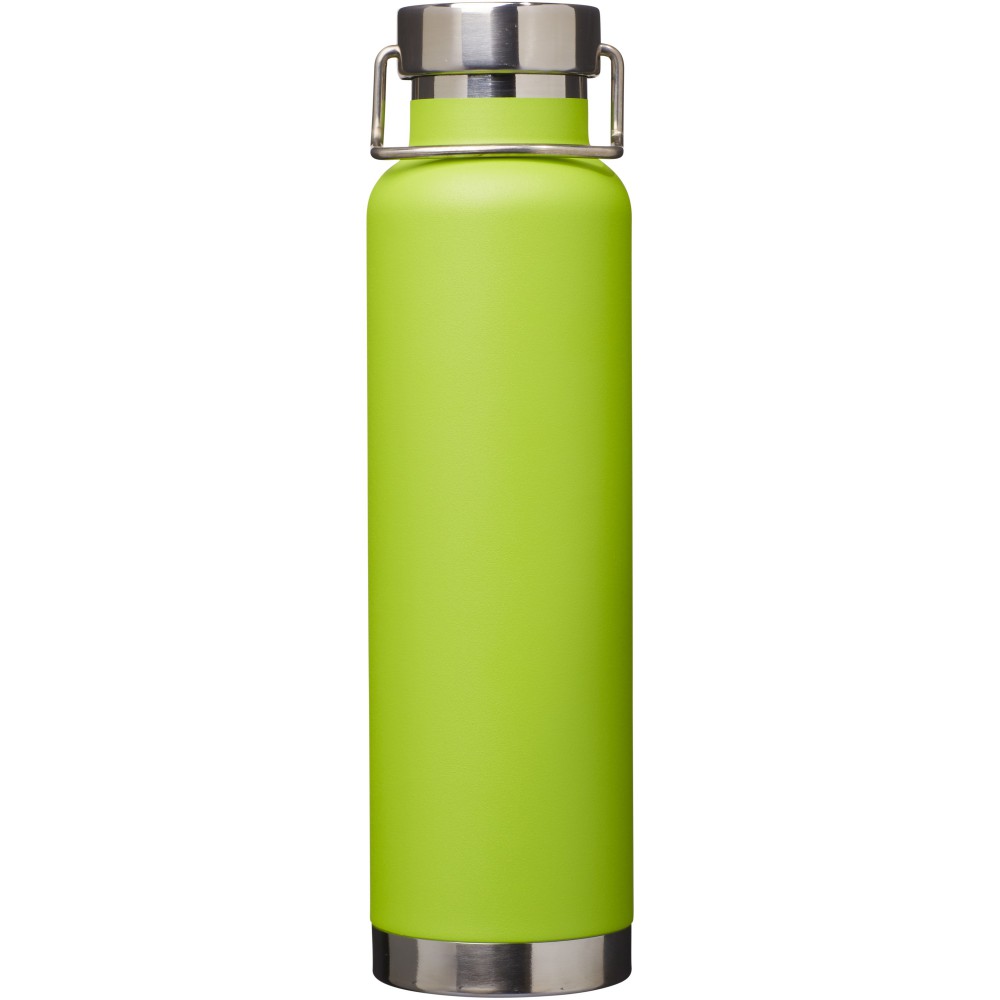 Thor duplafalú vákumos palack. Belső fala réz, ennek köszönhetően 48 órás hideg- és 12 órás melegtartási képességgel rendelkezik. Ez a kialakítás megakadályozza a kondenzációt a palack külső falán. A termoszhoz csavaros, rozsdamentes acél kupak tartozik. Széles kiöntő nyílással rendelkezik, amely akár jégkockák behelyezésére is alkalmas. Szivárgásmentes. Szénsavas italokkal nem használható. Mosogatógépben nem mosható és mikrohullámú sütőben történő melegítésre nem alkalmas. Űrtartalom: 650 ml. Csomagolása Avenue díszdoboz. Rozsdamentes acél. Emblémázás: Gravírozás, Tamponnyomás