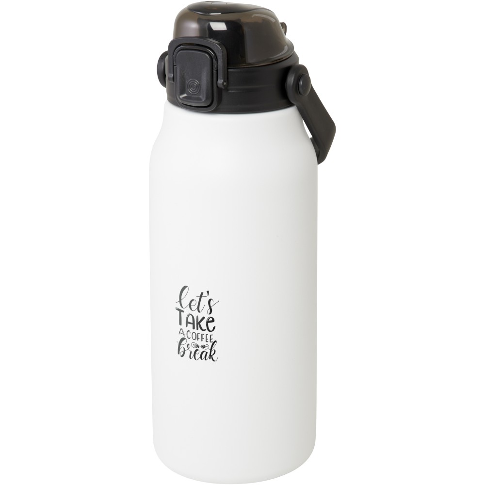 Ez a nagyméretű, RCS tanúsítvánnyal rendelkező, újrahasznosított rozsdamentes acél palack stílusosan hidratál egész nap. A réz vákuumszigetelés több órán át melegen vagy hidegen tartja az italokat, és az összecsukható fogantyúval könnyen hordozható. A palack szivárgásmentes, és gombos nyitómechanizmussal rendelkezik. Nagy űrtartalmú palack: 1600 ml. Újrahasznosított kartonból készült díszdobozban szállítjuk. Emblémázás: Gravírozás