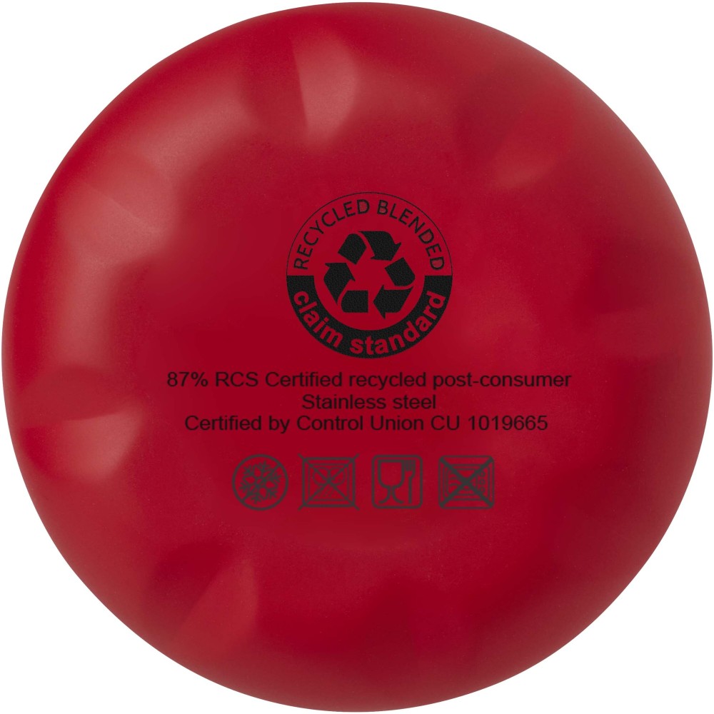 Vákuumszigetelt, RCS tanúsítvánnyal rendelkező, újrahasznosított rozsdamentes acél palack ikonikus dizájnnal, amely több órán keresztül tartja melegen vagy hidegen az italokat. A legtöbb pohártartóba illeszkedő talppal ellátott, elegáns megjelenésű vizespalack tökéletes promóciós termék. A német élelmiszer-biztonsági jogszabályok (LFGB) szerint, valamint a REACH-szabályozásnak megfelelően ftalát-tartalomra tesztelt és jóváhagyott. Űrtartalma: 500 ml. Újrahasznosított kartonból készült díszdobozban szállítjuk. Emblémázás: Bögredekor, Gravírozás