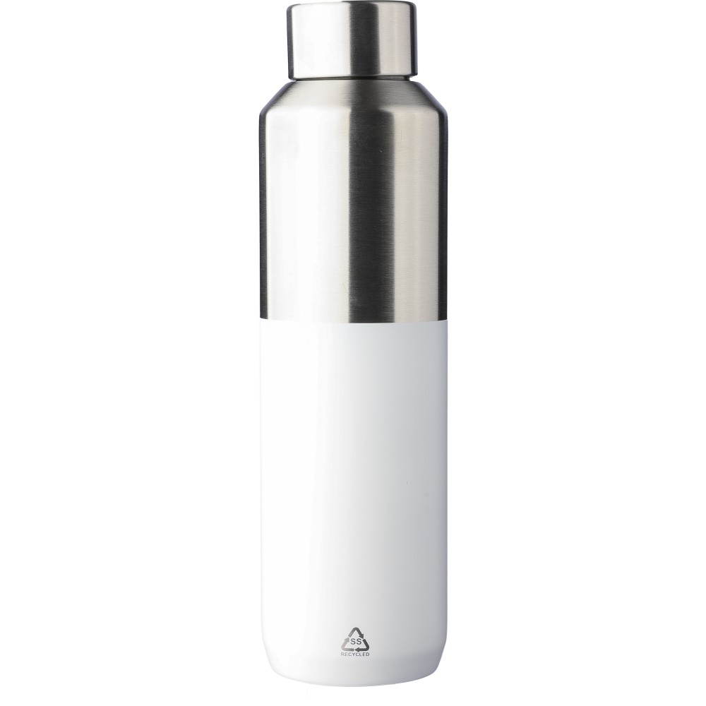 Újrahasznosított rozsdamentes acél palack, 600 ml. Duplafalú, vákuumszigetelt, a belső 304-es, a külső pedig 201-es rozsdamentes acélból készült. Kupakja PP, 201-es rozsdamentes acél külsővel. Elején gravírozott újrahasznosított logó található. Csomagolása barna papírdoboz. Emblémázás: Gravírozás, Körszita