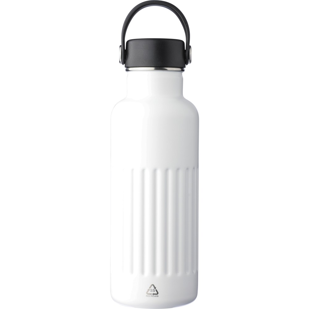 Újrahasznosított rozsdamentes acél termosz, 500 ml. A belső 304-es, a külső 201-es rozsdamentes acélból készült, bordás markolattal, PP és fém fedéllel, műanyag hordozófüllel. Gravírozott újrahasznosított logó található a terméken. Csomagolása barna papírdoboz. Emblémázás: Bögredekor, Gravírozás