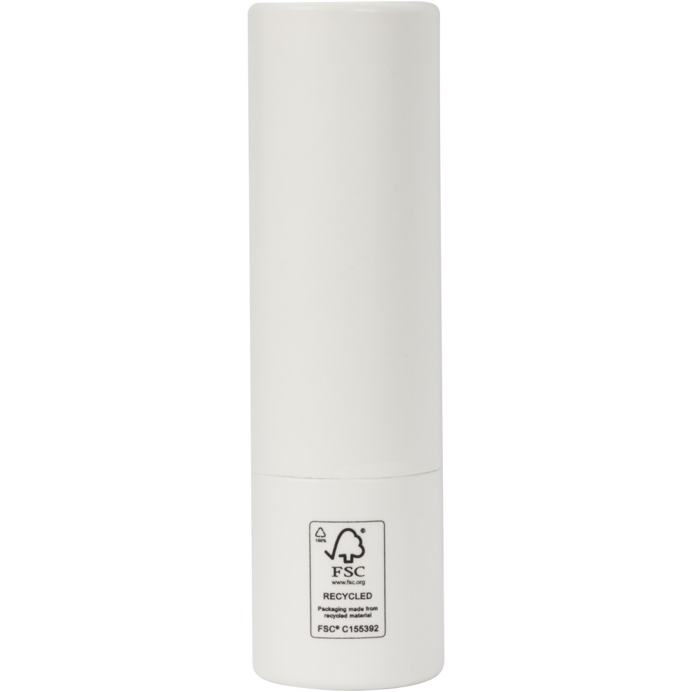 Ajakápoló. Védelmet nyújt a nap ultraibolya (UV) sugarai ellen. Úgy tervezték, hogy hidratálja és védje az ajkakat. A külső burkolat újrahasznosított papírból készült. Jó választás magánszemélyek és vállalkozások számára, akik a fenntarthatóbb termékeket részesítik előnyben. Az illata vanília. Szavatosság: vásárlástól számított 3 év. FSC újrahasznosított 100% P10 CU-COC-877277. Emblémázás: Tamponnyomás, UV nyomtatás