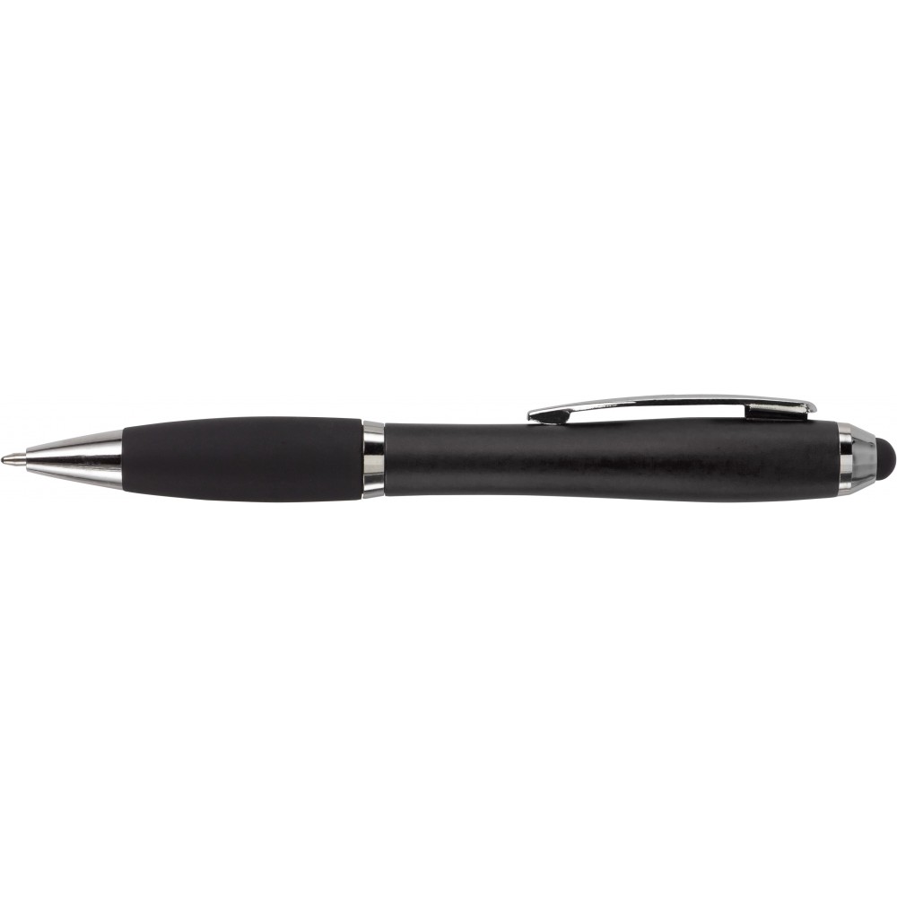 Érintős golyóstoll fekete tollbetéttel. A tetején lévő gumi segítségével érintőképernyős eszközökön használható. Emblémázás: Tamponnyomás, UV nyomtatás