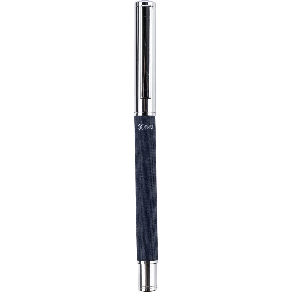 Sárgaréz és rPET golyóstoll fém klipsszel és markolattal. Csúszó mechanizmussal és rPET logóval a tolltesten. Egyenként csomagolva barna kartondobozban. Kék tollbetéttel. Emblémázás: Gravírozás
