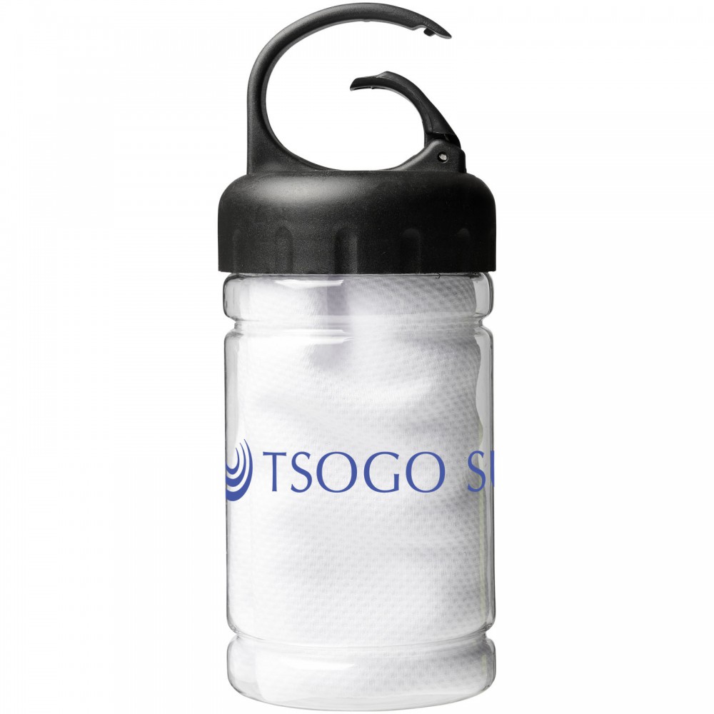 Hűtőtörölköző PET tartóban. A törököző mérete: 30 x 80 cm. 100% poliészter. Emblémázás: Tamponnyomás