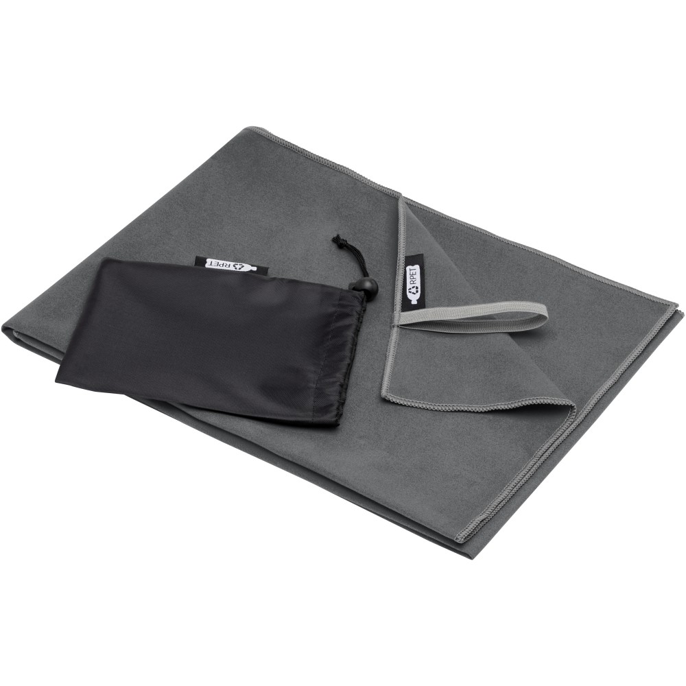 A Pieter sporttörülköző nagyon jó nedvszívó, könnyű, gyorsan szárad, az anyaga pedig tartós és rendkívül puha. Ha a törölközőt összehajtjuk és gumiszalaggal rögzítjük, kis méretűre csomagolható, így alkalmas arra, hogy magunkkal vigyük az edzőterembe, uszodába, vagy ha hátizsákos túrára, esetleg kempingezésre megyünk. A törülköző 50 x 100 cm méretű, 90% GRS újrahasznosított poliészterből és 10% nejlonból készült, és 40 °C-on mosható mosógépben. Újrahasznosított PET műanyagból készült tároló tasakkal (17 x 13 cm) szállítjuk. Emblémázás: Hímzés, Szitanyomás