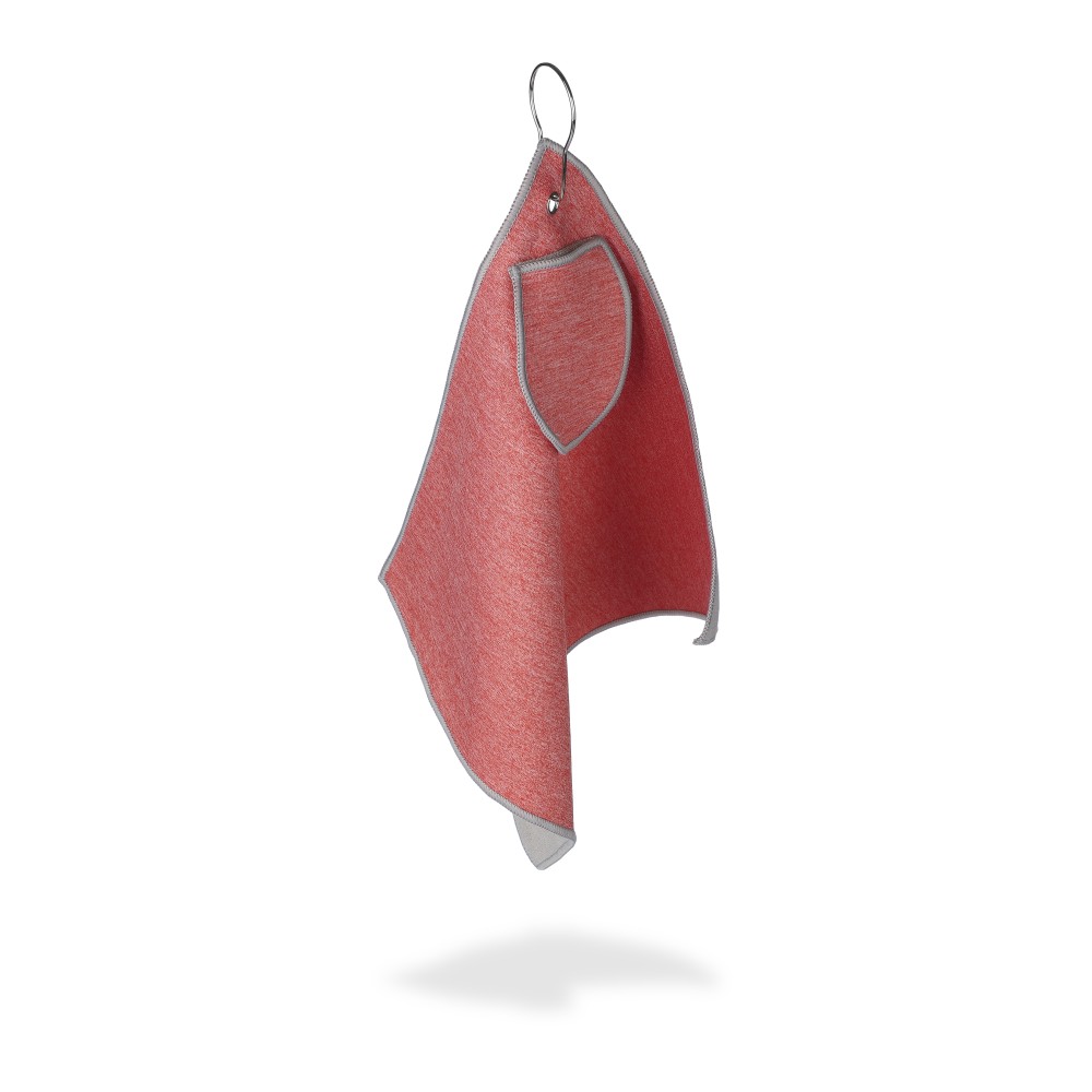 rPET golftörölköző tartozék labdatartó tokkal. A fém kampó segítségével könnyen a táskához csatlakoztatható. Belül rPET címkével. Mosógépben alacsony hőmérsékleten mosható. Emblémázás: Hímzés, Szitanyomás