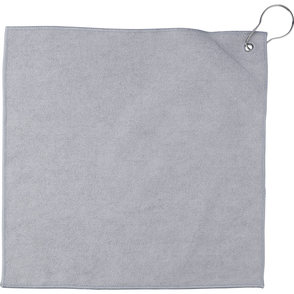 rPET golftörölköző tartozék labdatartó tokkal. A fém kampó segítségével könnyen a táskához csatlakoztatható. Belül rPET címkével. Mosógépben alacsony hőmérsékleten mosható. Emblémázás: Hímzés, Szitanyomás