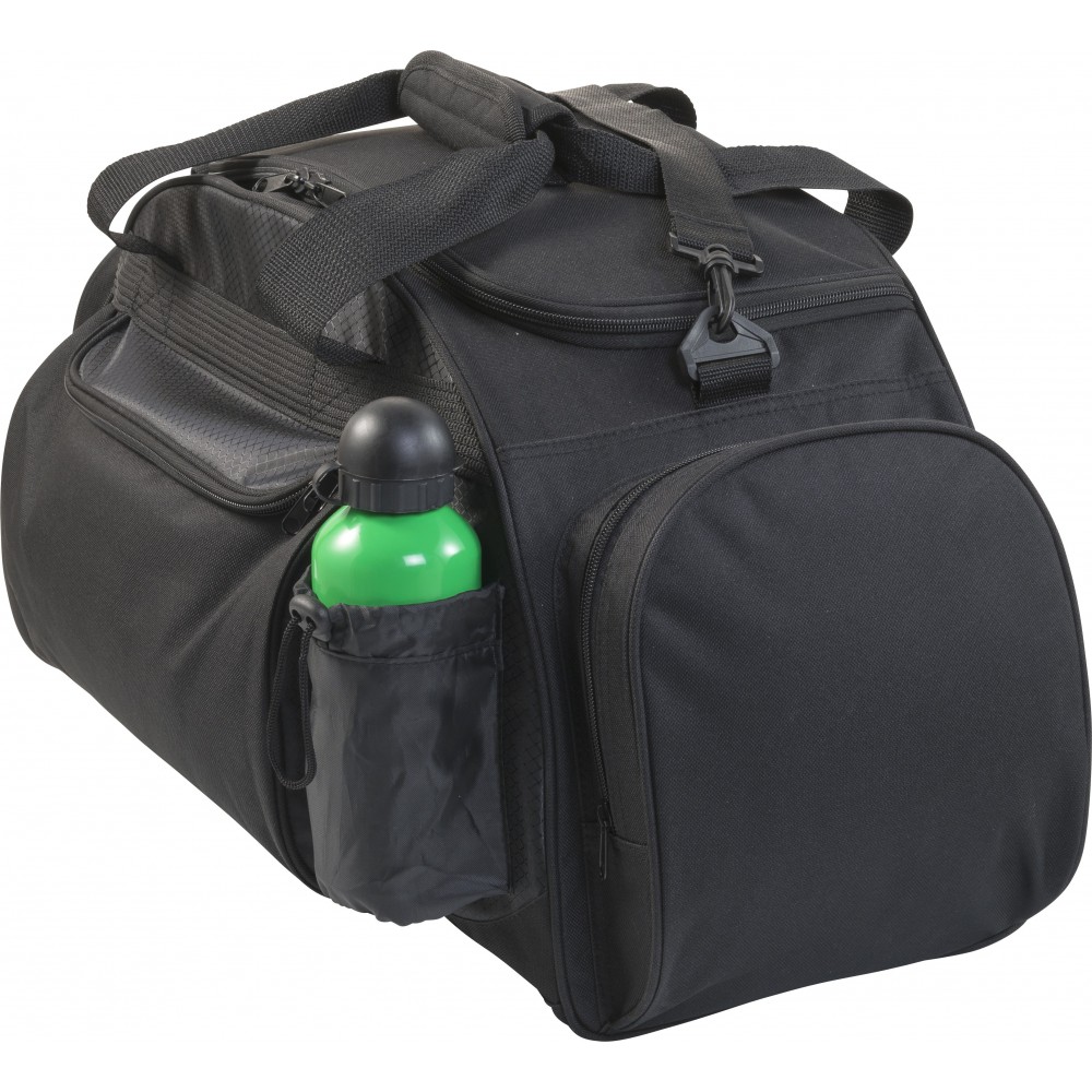 600D poliészter utazótáska egy első zsebbel, egy palacktartó és egy headset elhelyezésére való oldalzsebbel és egy nagy cipzáros rekesszel. Emblémázás: Szitanyomás
