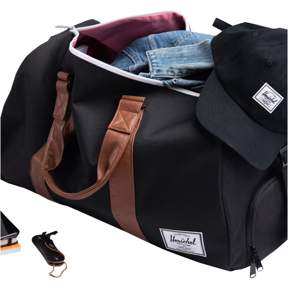 A tökéletes útitáskát keresed? A Herschel Novel táska a tiéd. Masszív tartósságra és intelligens szervezésre tervezték, és jellegzetes cipőrekesszel rendelkezik. A 100%-ban újrahasznosított EcoSystem szövetekből szakértelemmel készített táska kényelmesen elfér a repülőgépek fej feletti csomagtartójában is, így tökéletes útitárs. A 600D anyagot átgondoltan 100%-ban újrahasznosított vizespalackokból alakították ki, míg a vízálló cipzáras zárás biztosítja az értékes alapvető dolgok védelmét. Ez a táska vegán bőrből készült fogantyúval és levehető, sima hevederes vállpánttal rendelkezik, amely EVA párnázással van ellátva a kényelmes hordozás érdekében. A Herschel Novel táska egy külső zsebbel is rendelkezik, amely lehetővé teszi, hogy könnyedén rendszerezze és hozzáférjen holmijaihoz. A 43 literes térfogatának köszönhetően tökéletes útitárs a következő kalandodhoz. Emblémázás: Szitanyomás