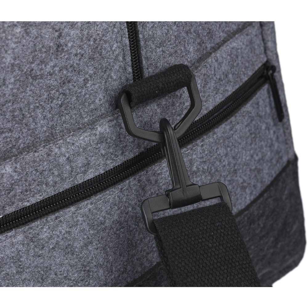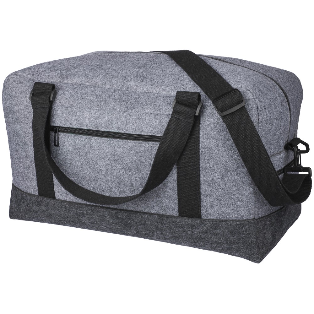 Sporttáska rPET filc anyagból vászon fülekkel és állítható vállpánttal. Egy nagy cipzáras rekesszel és a táska elején egy kicsi cipzáras zsebbel. rPET címkével. Úrtartalom: 30 liter, teherbíró képesség: 10 kg. Emblémázás: Szitanyomás