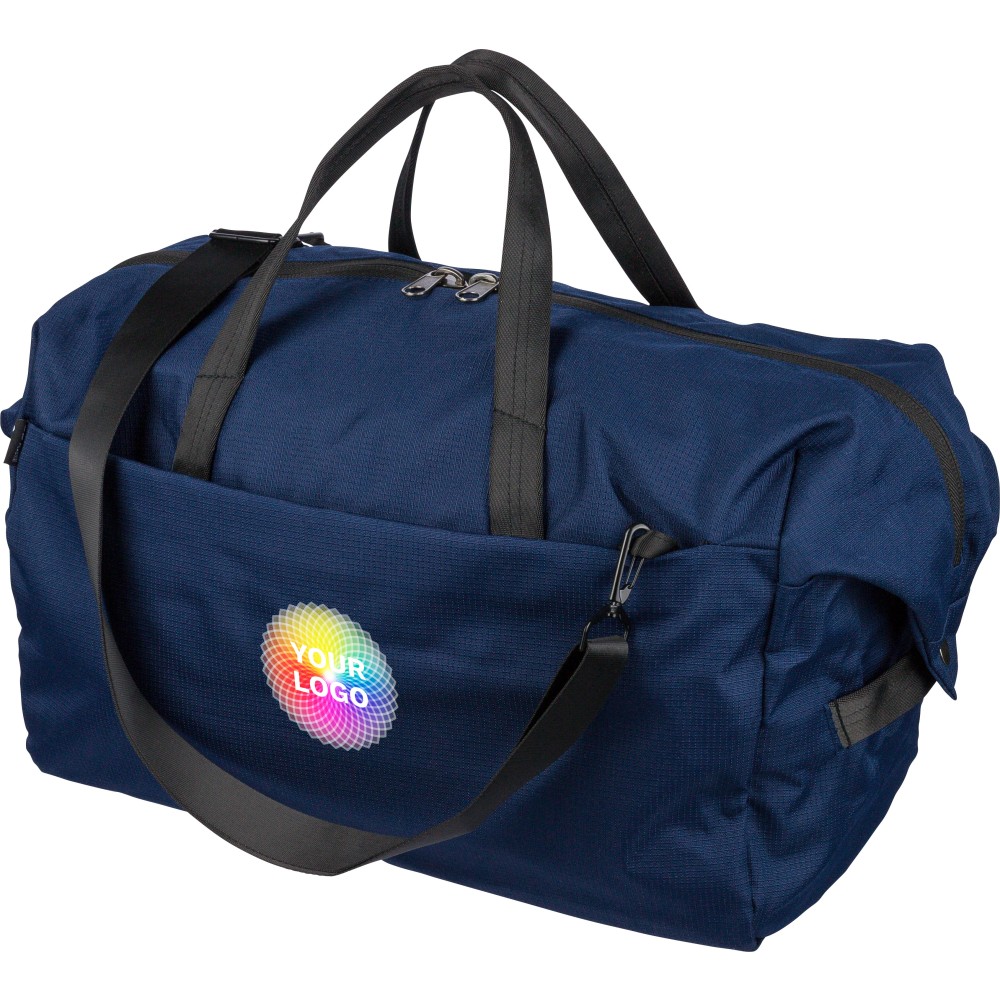 RPET 300D Ocean Bound anyagból készült sporttáska, amely újrahasznosított óceáni műanyagból készül, tartós és texturált felületű kivitelben. 33,7 literes űrtartalommal rendelkezik, nagy fő rekesszel, elülső cipzáras zsebbel és belső cipzáras tárolóval. Két erős fogantyúval, állítható vállpánttal és Ocean Bound Plastic alapanyagra utaló címkével ellátva. Emblémázás: Szitanyomás