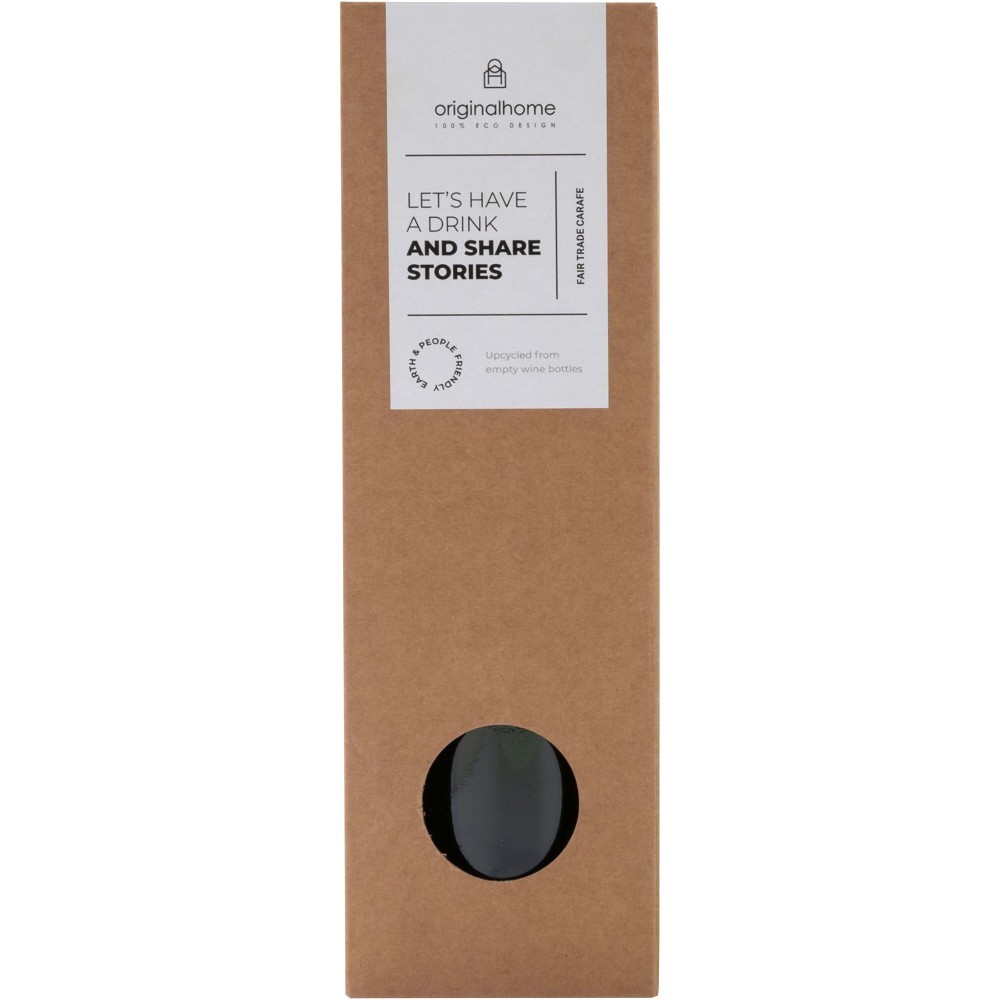 Kézzel készített, 750 ml-es vizeskancsó, amely Zanzibárból, Tanzániából származó újrahasznosított borospalackokból készült. A borospalackokat szállodákból, éttermekből és bárokból gyűjtik, majd válogatják, tisztítják és különböző formákra és méretekre vágják. Ajándékdobozban szállítjuk. Emblémázás: Matricázás