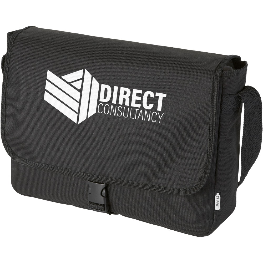 Újrahasznosított PET műanyagból készült válltáska állítható vállpánttal. Egy fő rekesszel, amely fedéllel és csattal záródik. Emblémázás: Szitanyomás