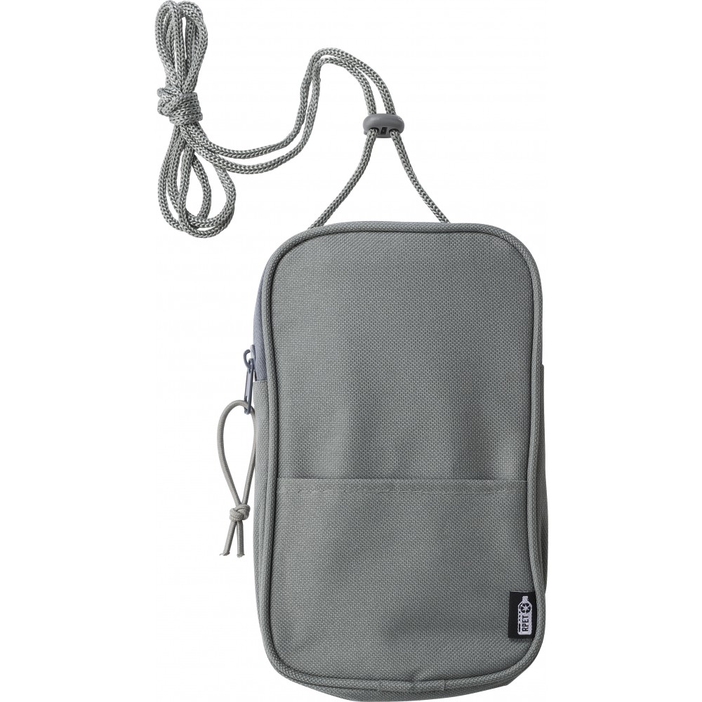 Nyakbaakasztható kistáska egy cipzáros résszel és egy nyitott zsebbel, állítható pánttal. 600D RPET anyag. Emblémázás: Szitanyomás