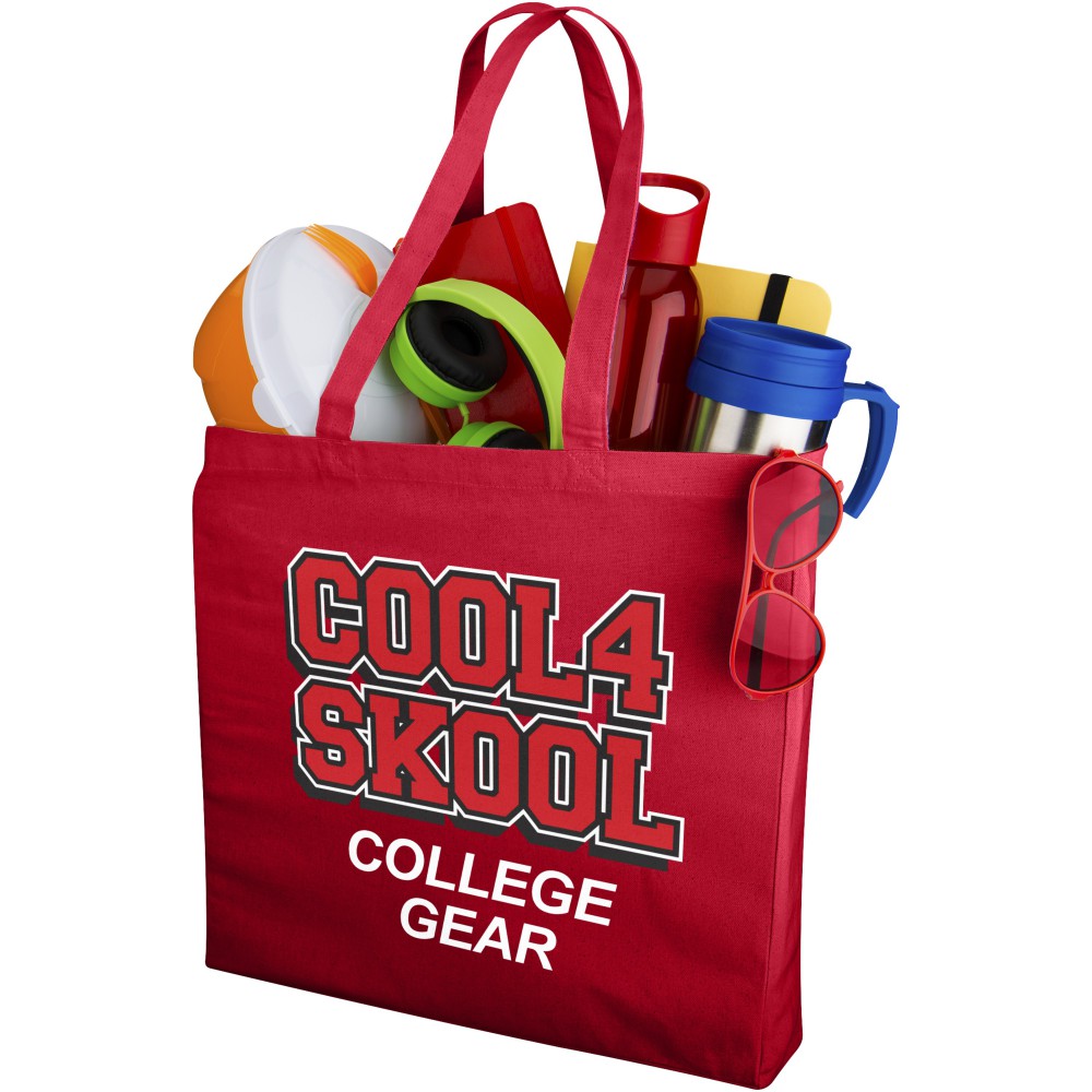 Nyitott tetejű táska háromszög alakú oldalbetéttel. A lehajtható fülek magassága 31 cm. Emblémázás: Szitanyomás