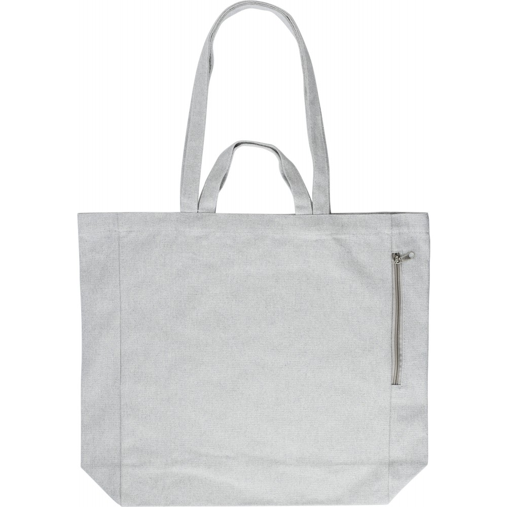 Újrahasznosított pamut bevásárlótáska rövid és hosszú füllel. Oldalt cipzáras zseb. 350g/m2 Emblémázás: Szitanyomás