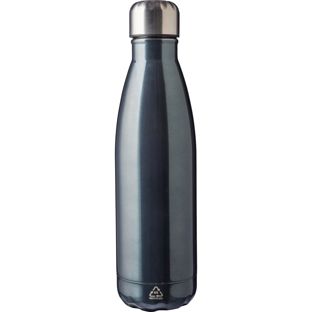 Újrahasznosított rozsdamentes acél, egyrétegű kulacs csavaros kupakkal. 304-es rozsdamentes acélból készült. Az újrahasznosított logó gravírozva van a kulacson. Egyenként barna kartondobozba csomagolva. Űrtartalom: 650 ml. Emblémázás: Bögredekor, Gravírozás