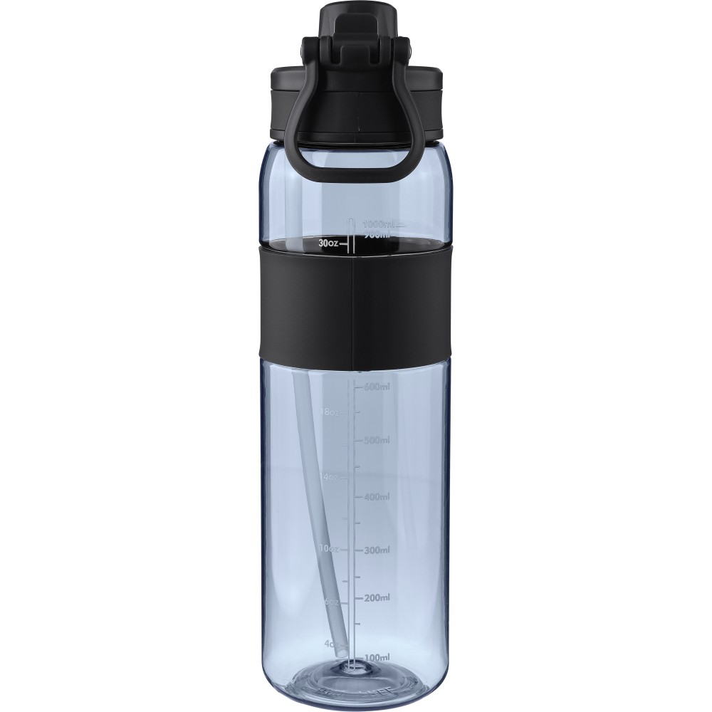 Tritán kulacs, 900 ml-es. Kétféle használati lehetőséggel: csavaros záródású kupak vagy visszahajtható végű szívószál. Szilikon markolattal, PP hordozófüllel és nyomtatott űrtartalom-jelzővel. Emblémázás: Tamponnyomás