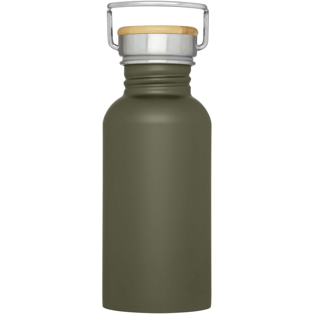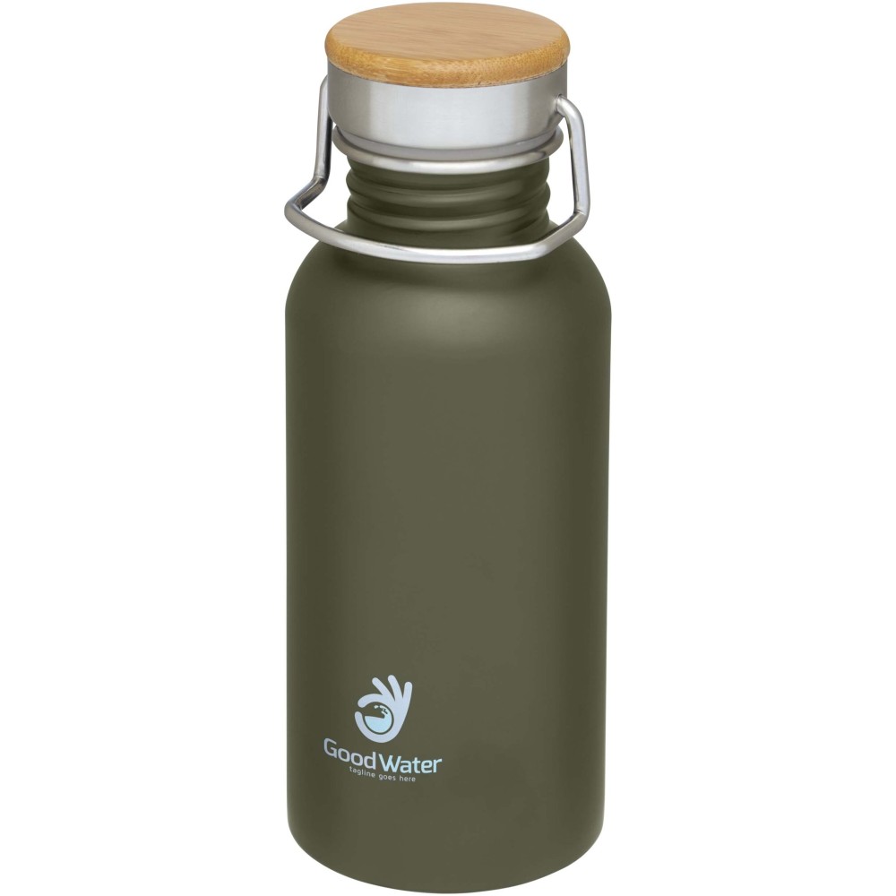 Egyfalú rozsdamentes acél palack csavaros tetővel. A fedélen bambusz rátét, valamint egy fül a könnyű hordozhatóságért. Szivárgásmentes. Szénsavas italokkal nem használható. Mosogatógépben nem mosható és mikrohullámú sütőben történő melegítésre nem alkalmas. Űrtartalom: 550 ml. Csomagolása Avenue díszdoboz. Rozsdamentes acél, bambusz. Emblémázás: Bögredekor, Gravírozás, Körszita, Tamponnyomás