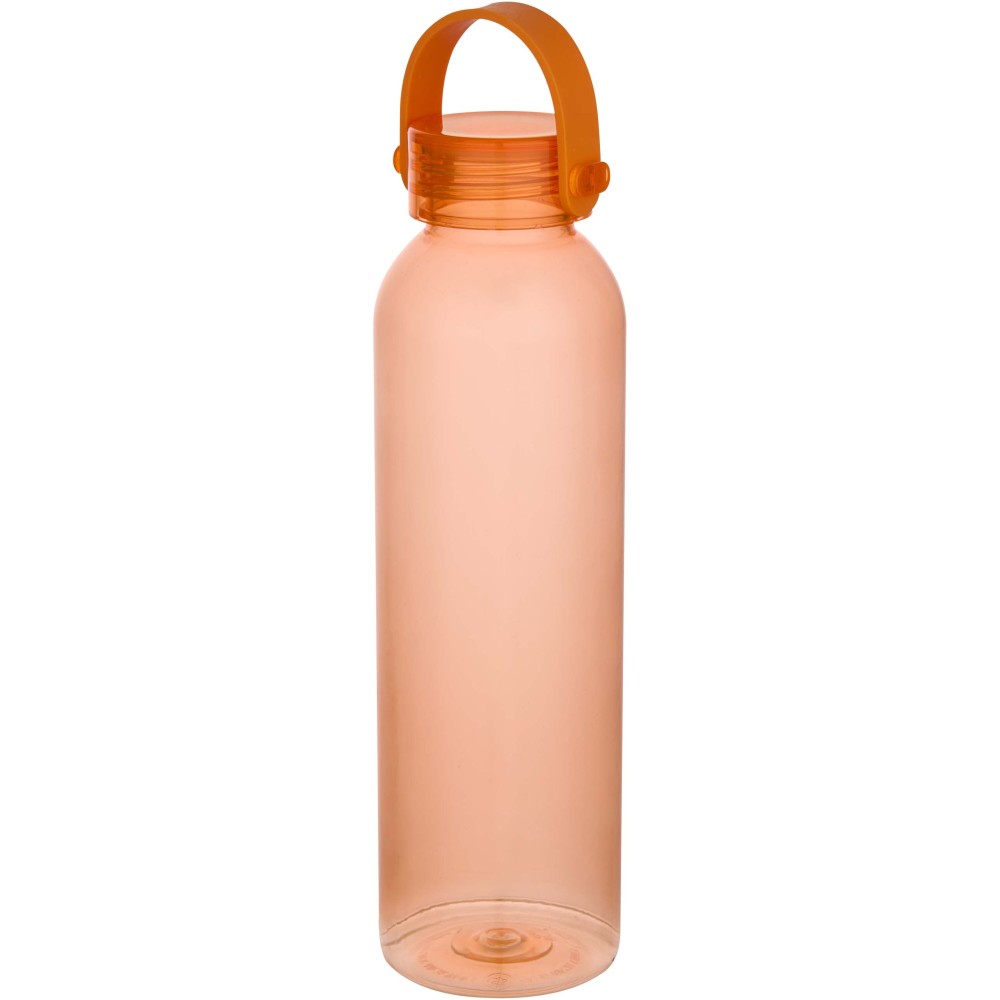 RCS tanúsítvánnyal rendelkező RPET-ből készült kulacs, praktikus szilikon hordozófüllel. Megfelel az EFSA által jóváhagyott PET-újrahasznosítási eljárásnak. Űrtartalom: 630 ml. Emblémázás: Körszita
