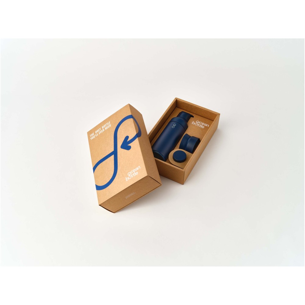 Az 500 ml-es Ocean Bottle szett egy egyedülálló moduláris fedélrendszerrel rendelkezik, amely 3 cserélhető fedéllel biztosítja a zökkenőmentes átmenetet az egyik tevékenységről a másikra. Ez az ajándékkészlet egy 500 ml-es Ocean Bottle palackból és 3 fedélből áll: az eredeti fedél (a mindennapi szivárgásmentes kortyoláshoz), a GO fedél (zárható szalmás fedéllel) és a brew fedél (forró italok élvezéséhez útközben). Kettős nyitási funkcióval ellátott moduláris palack, amely megkönnyíti a töltést, tisztítást és jég hozzáadását. Újrahasznosított anyagokból készült és mosogatógépben mosható. Felelősségteljesen beszerzett újrahasznosított karton ajándékdobozban kerül forgalomba. Emblémázás: Gravírozás
