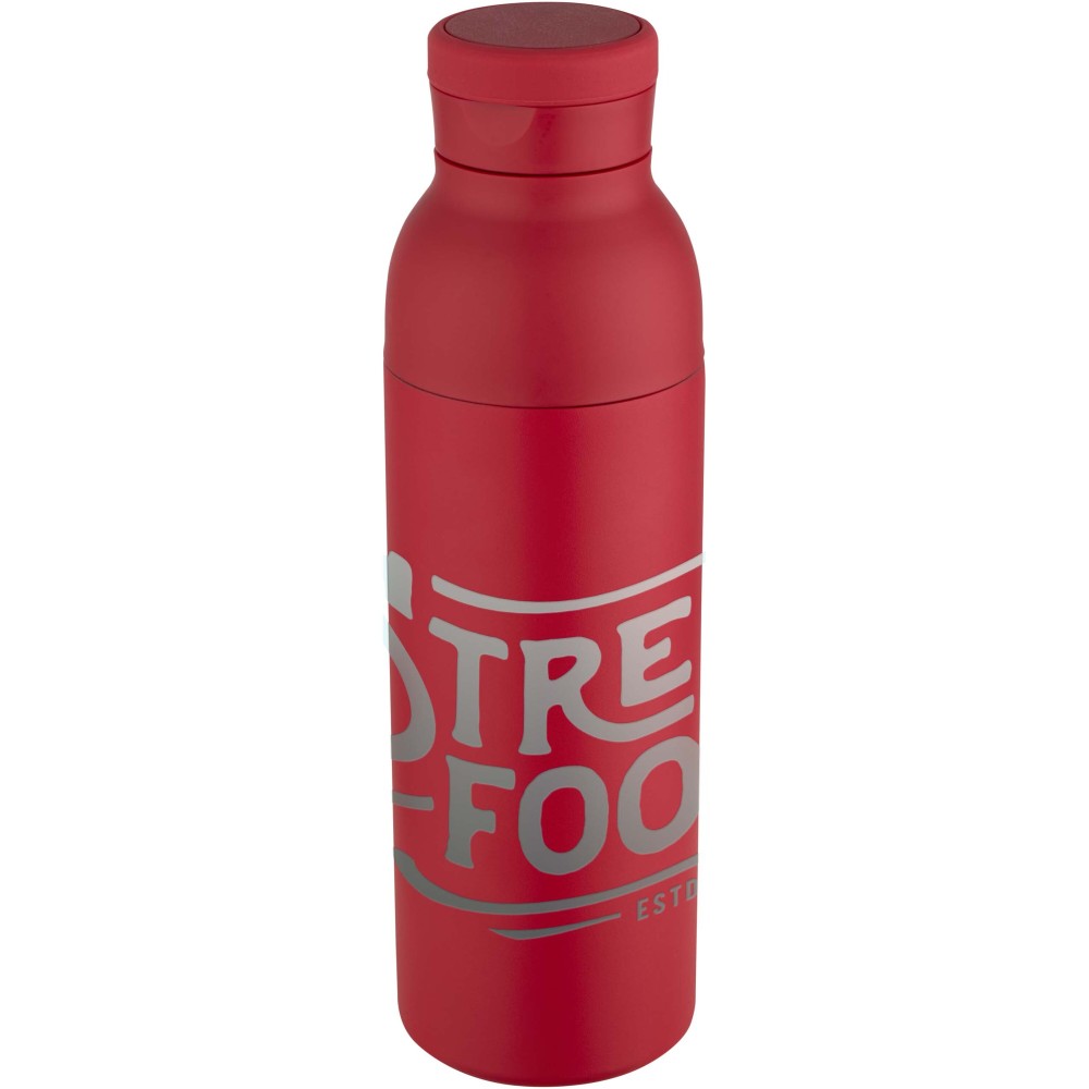 RCS tanúsítvánnyal rendelkező rozsdamentes acélból készült, duplafalú, vákuumszigetelt palack, amelynek fedelén egy diszkrét, beépített szilikon fogantyú található. Az italokat 48 órán át hidegen, vagy akár 12 órán keresztül melegen tartja. A két részből álló konstrukció megkönnyíti a tisztítást, míg a tartós porszórt bevonat és a belső rézszigetelés hosszú élettartamot és kiváló hőtartást biztosít. A terméket újrahasznosított kartonból készült ajándékdobozban szállítjuk. Űrtartalma: 650 ml.